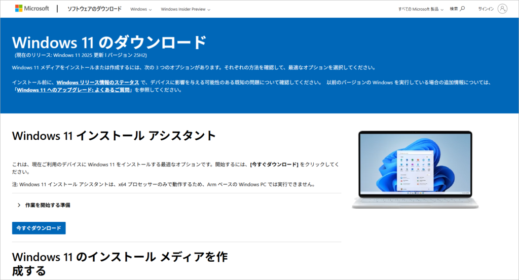 2. [Windows11 インストール アシスタント]欄の[今すぐダウンロード]をクリックし、表示される指示(ウィザード)に従って操作します。