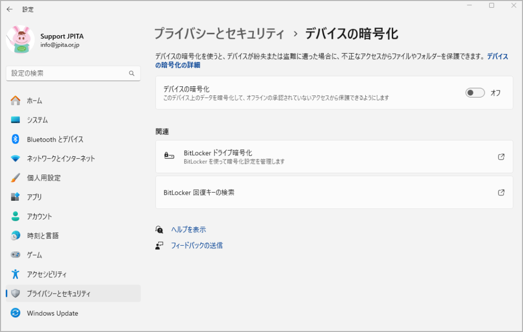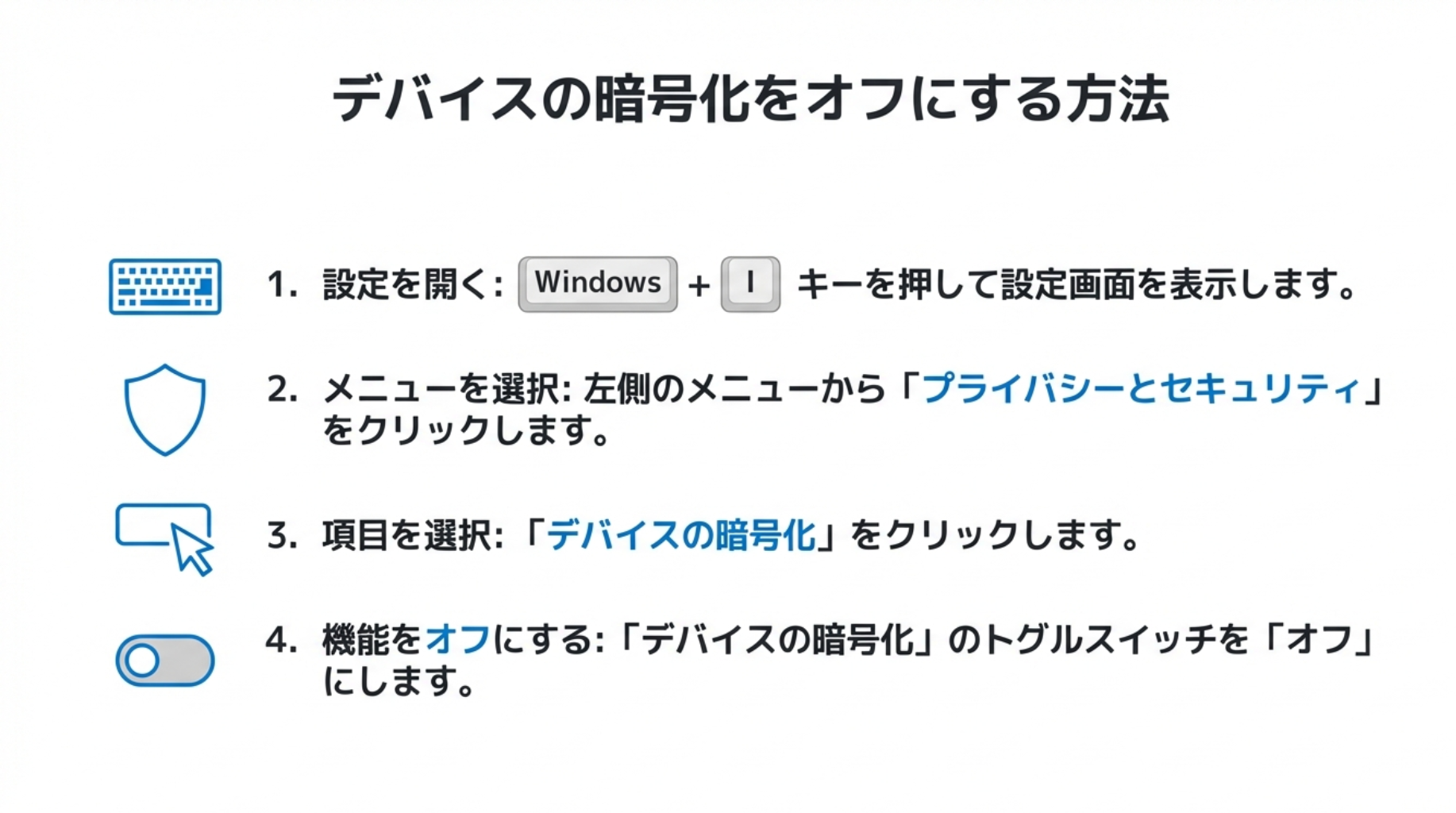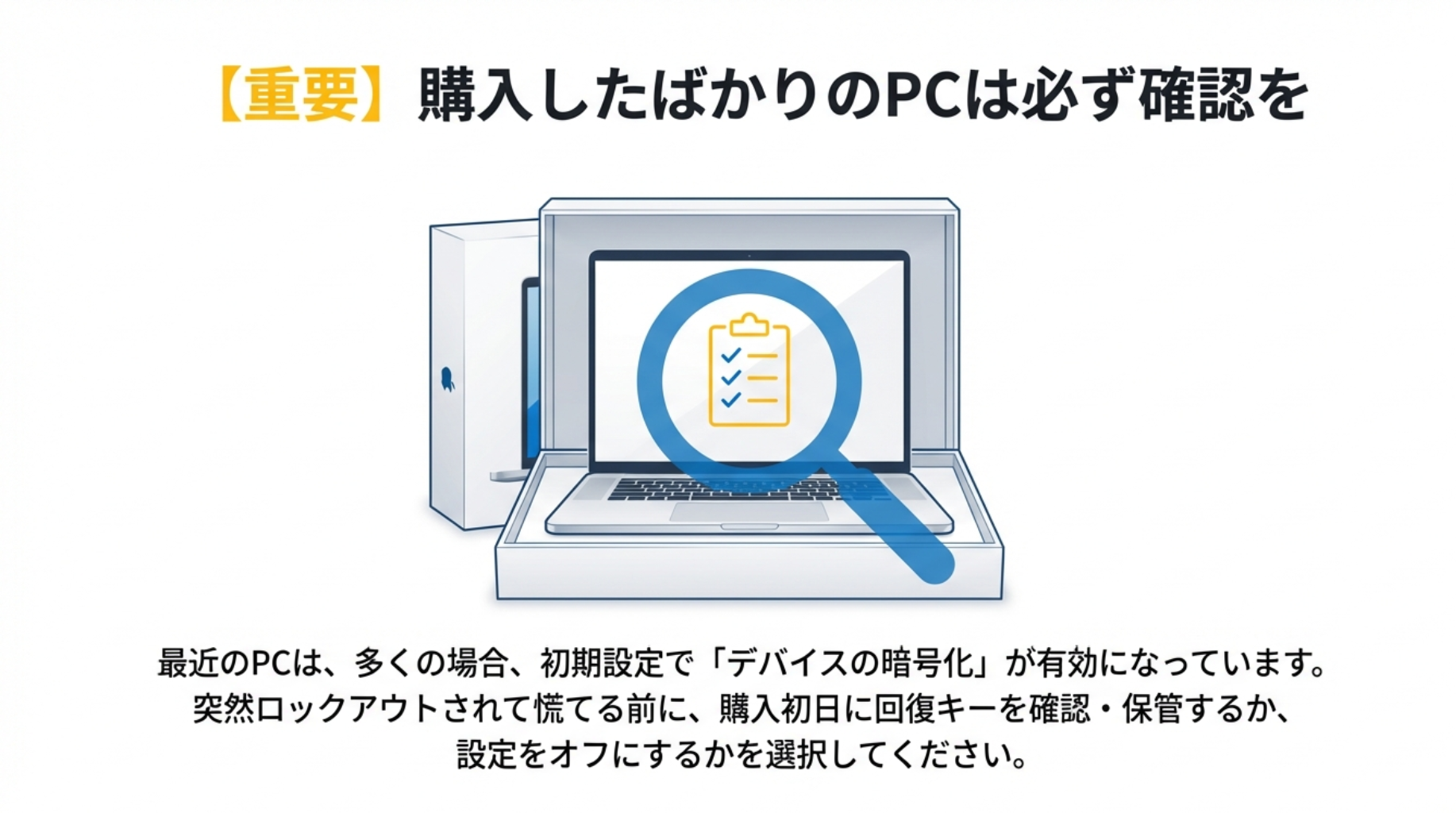 最近購入したパソコンの場合、デバイスの暗号化が初期設定で「オン」になっている場合もあるため、確認が必要です。