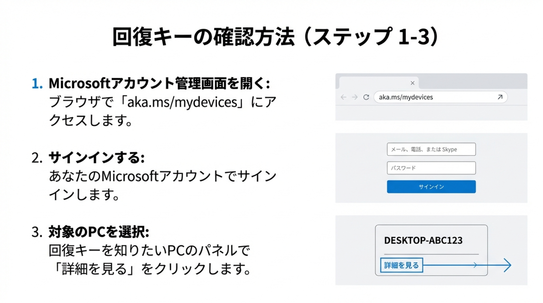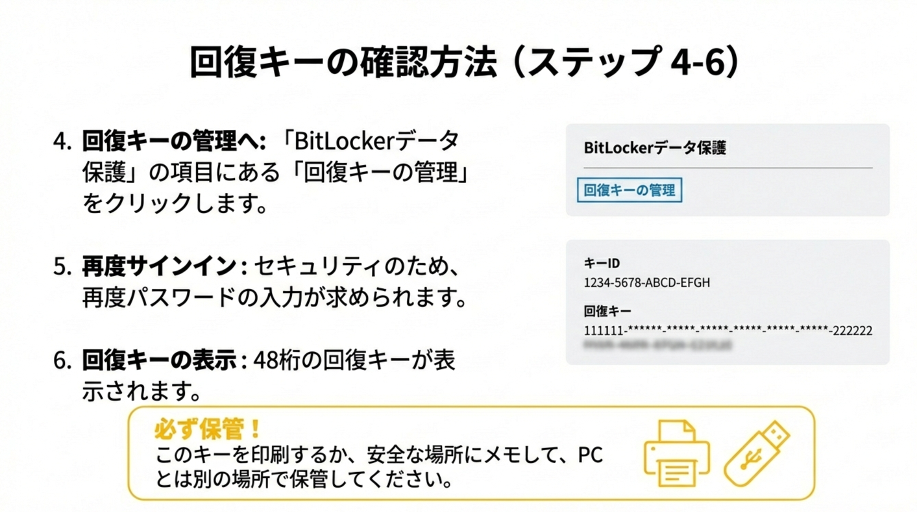 デバイスの暗号化を「オン」にして、BitLockerを有効にした場合は、回復キーを確認しておきます。