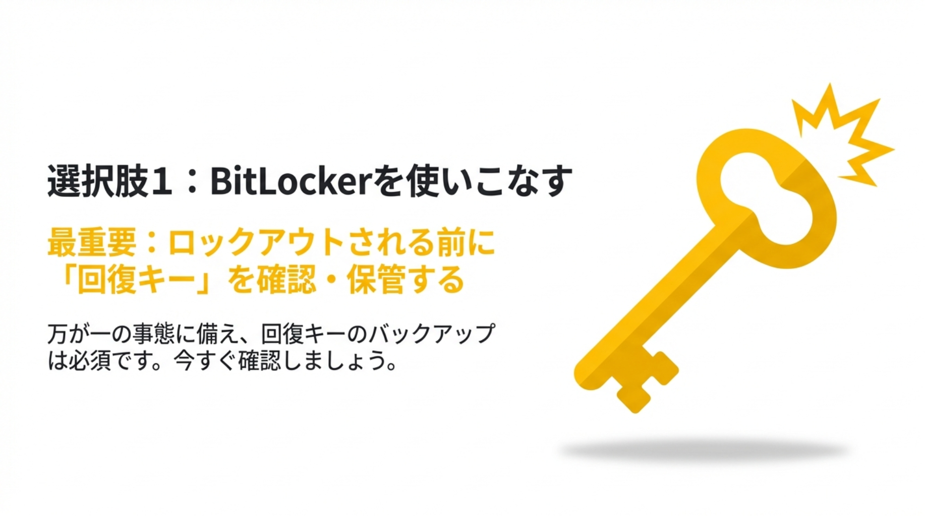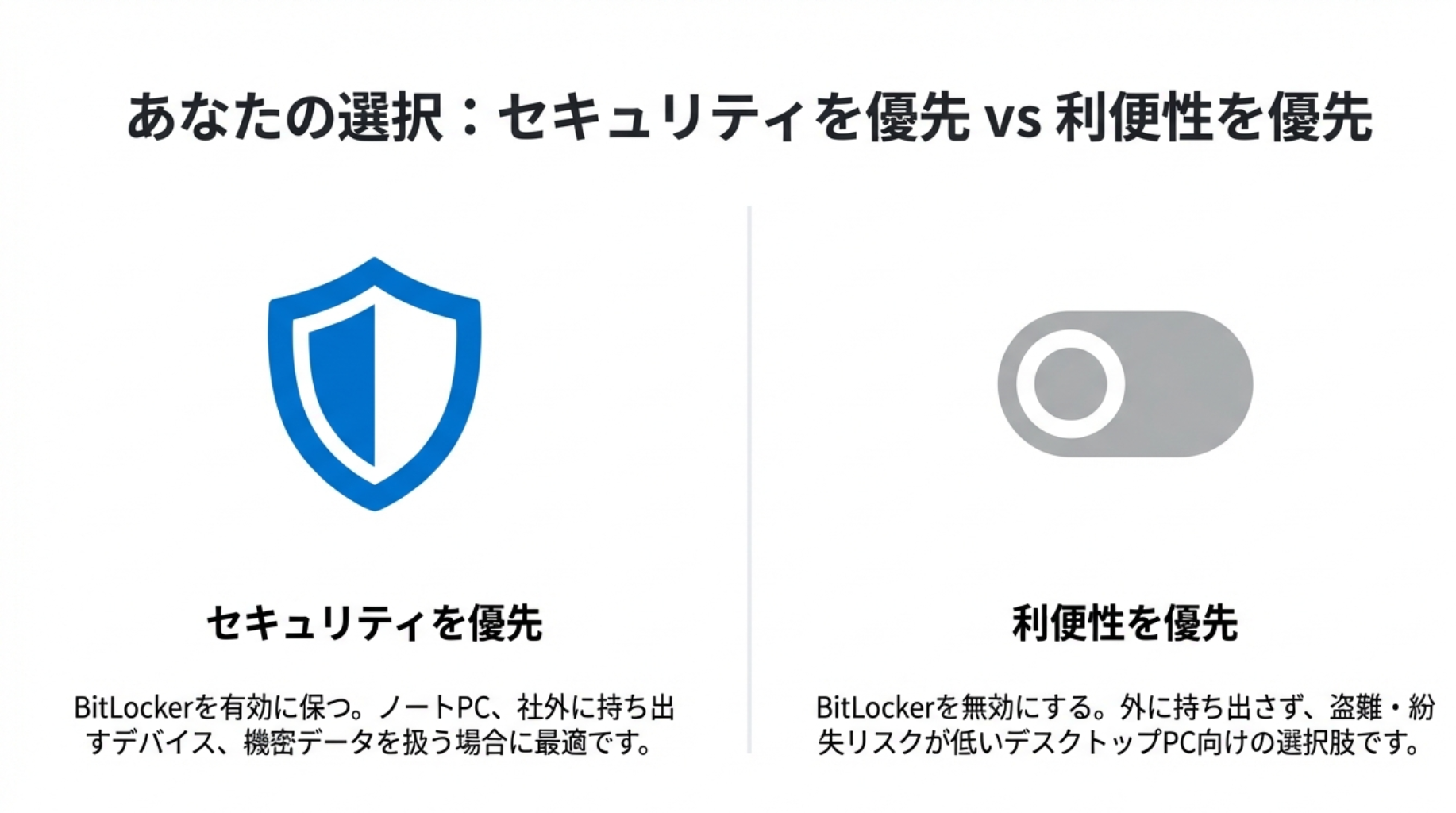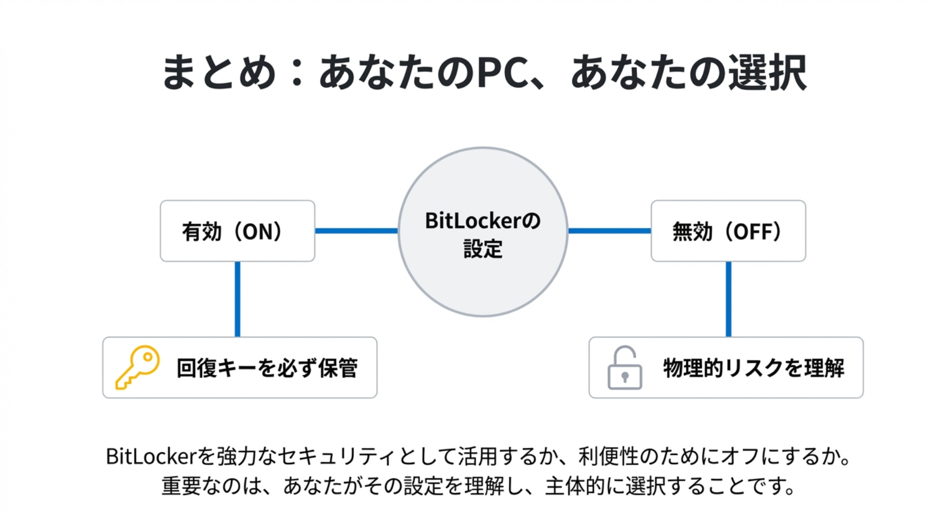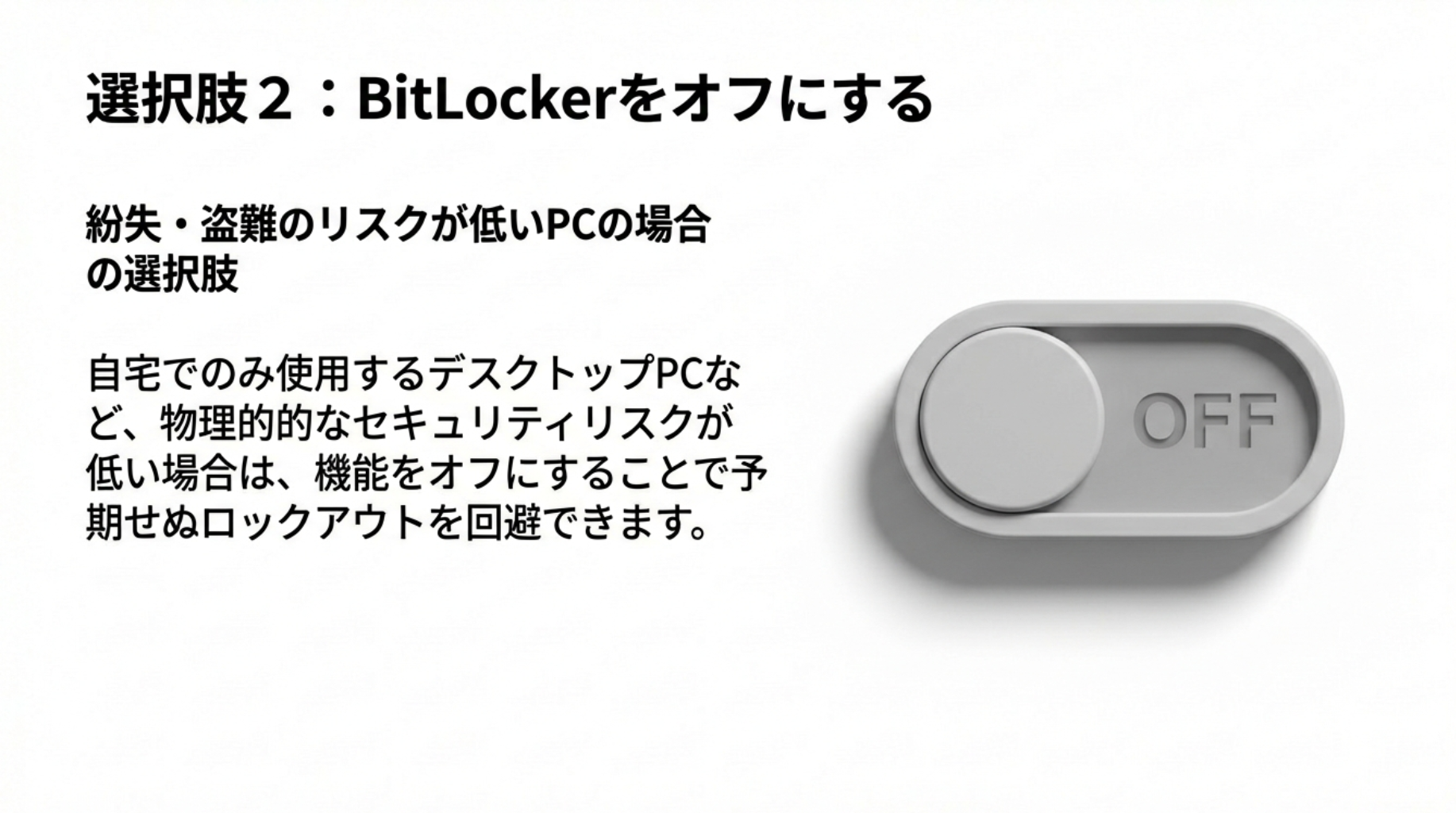 個人でパソコンを使用し、外に持ち出さないなら盗難や紛失するリスクもないため、BitLockerの機能を「オフ」にするのも得策です。