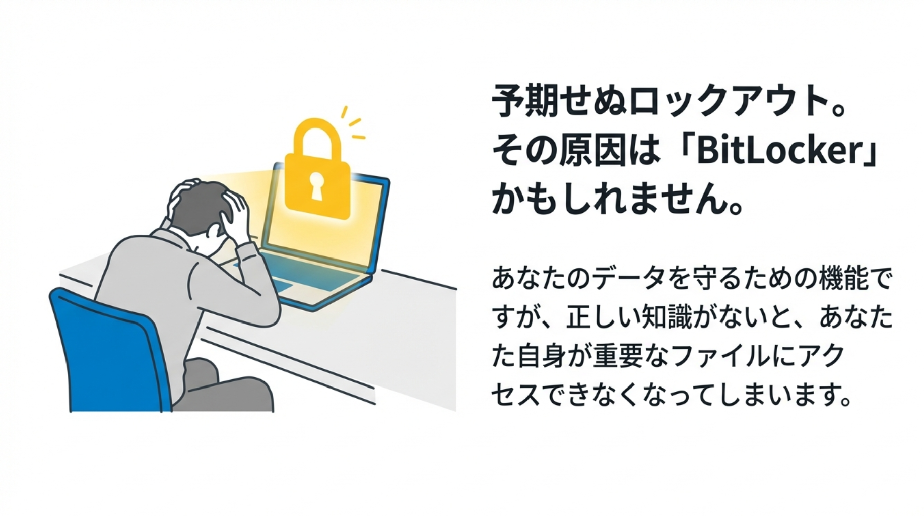 Windows11 HomeはBitLockerそのものは利用できないものの、簡易版[デバイスの暗号化]機能を備えています。とても便利な機能ですが、何らかの原因でBitLockerのロックがかかってしまうと、自分でもパソコンにアクセスできなくなるため、BitLockerの仕組みを理解しておく必要があります。