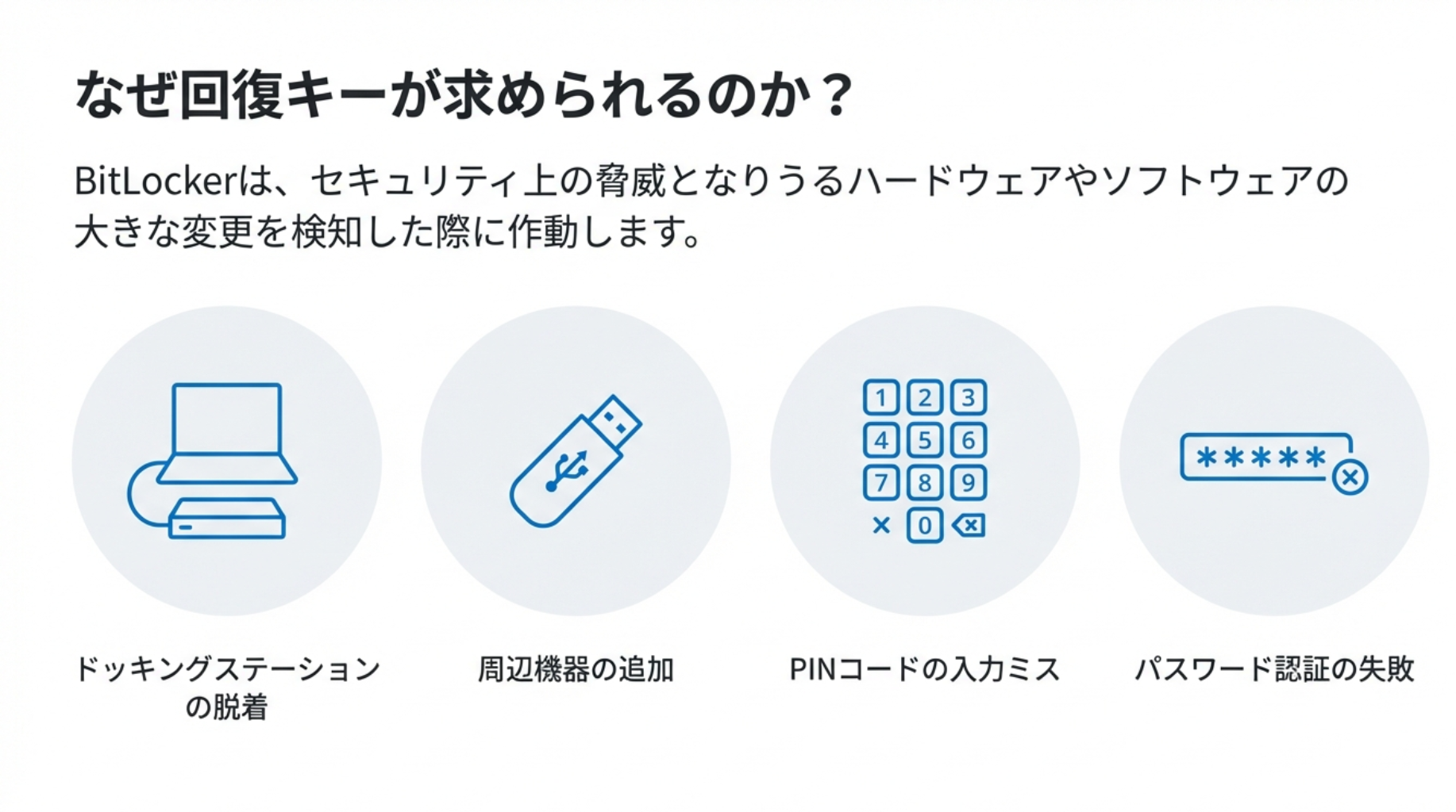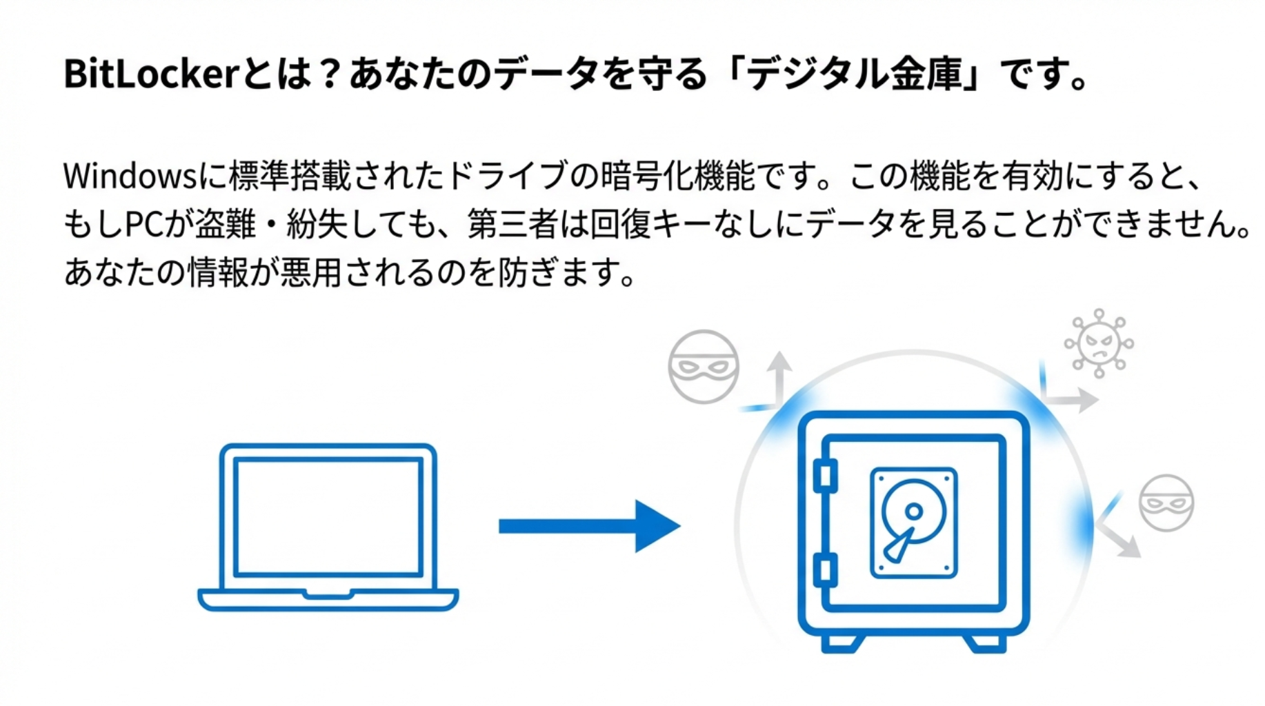 BitLocker(ビットロッカー)は、Windowsに標準搭載されたファイルシステムの暗号化機能のことです。この機能を有効にすると、内蔵ドライブを他のパソコンに接続してデータを抜き取ろうとしても、回復キーの入力が求められます。正しく入力できなければアクセスできないため、盗難や紛失、パソコンを売却や処分した場合でも、悪意ある第三者に情報を抜き取られる心配がありません。