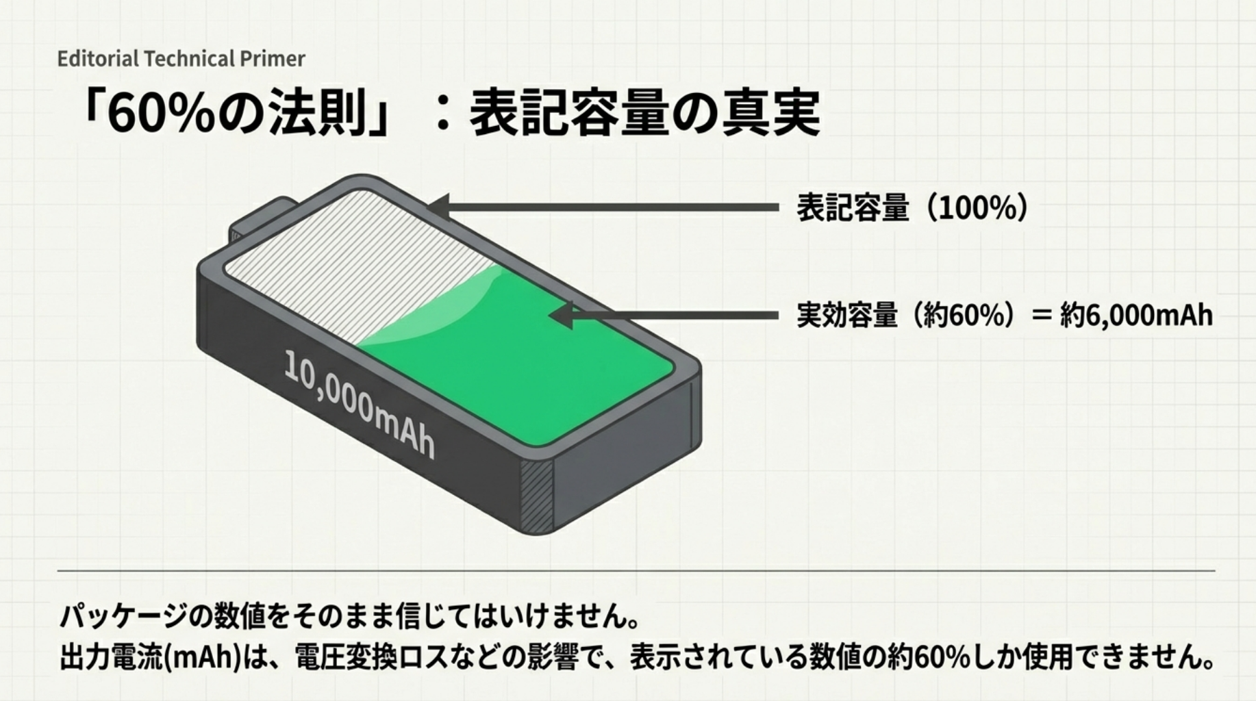 実はモバイルバッテリーに表示されている容量のすべてを、そのまま充電に使えるわけではありません。実際に使えるのは、表示されている数値の約60%程度です。
