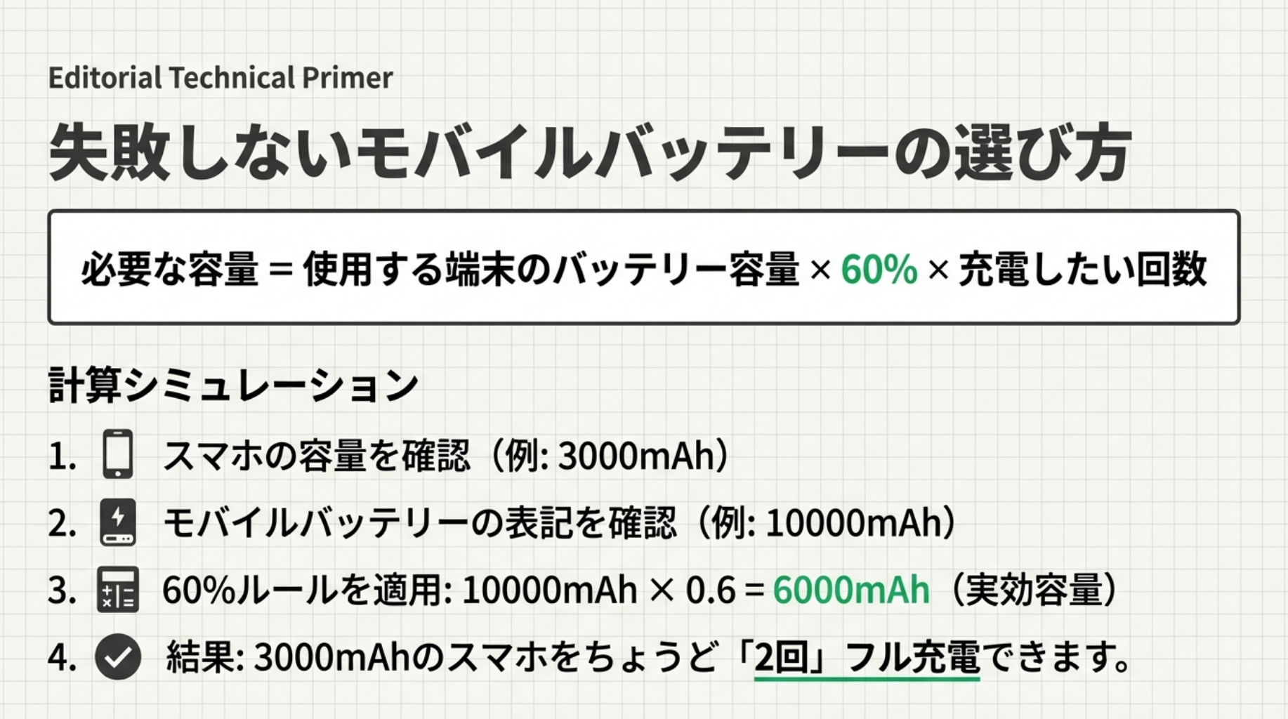モバイルバッテリー選びでは、つい一番大きな「mAh」の数字に目が行きがちです。