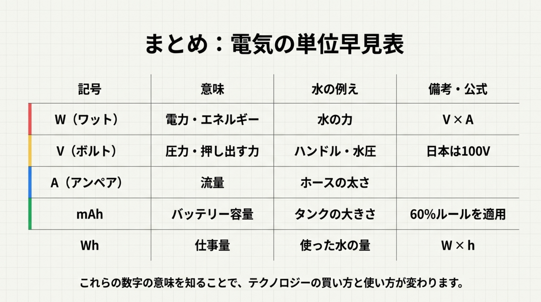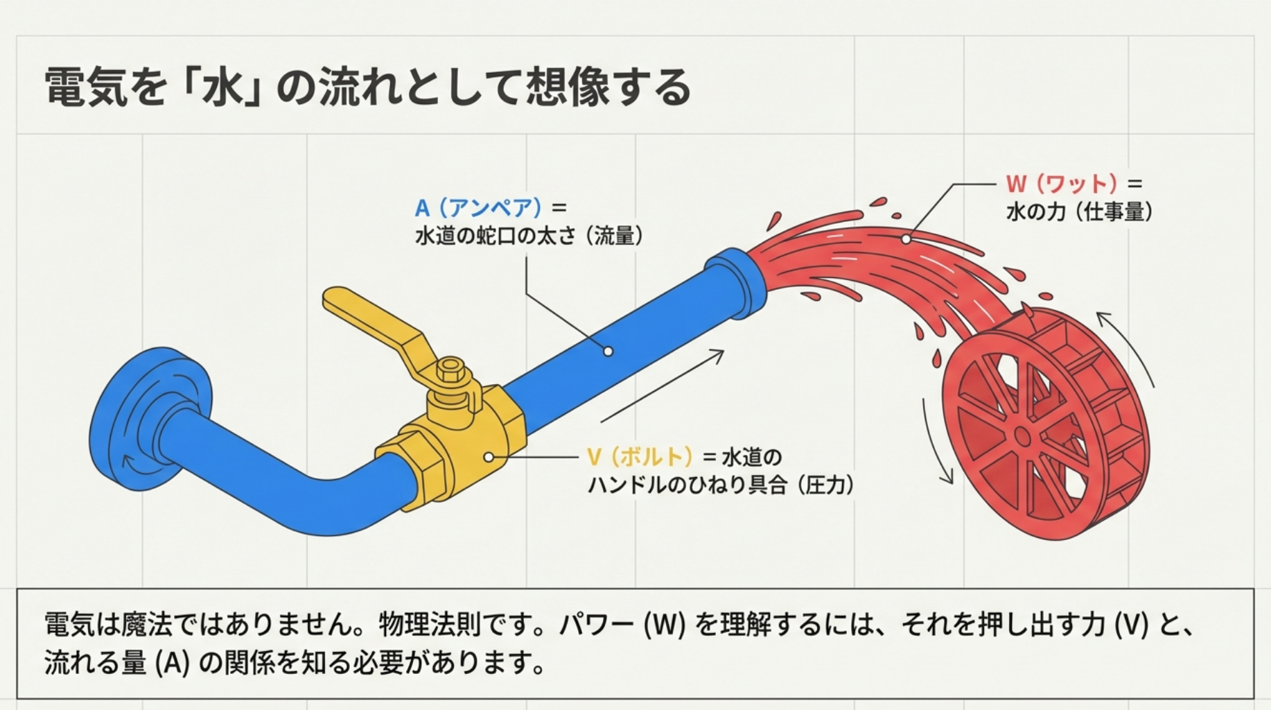 製品仕様を見ていると必ず出てくるW(ワット)、V(ボルト)、A(アンペア)という単位。難しく感じるかもしれませんが、簡単な「水」の例えを使えばすぐに理解できます。