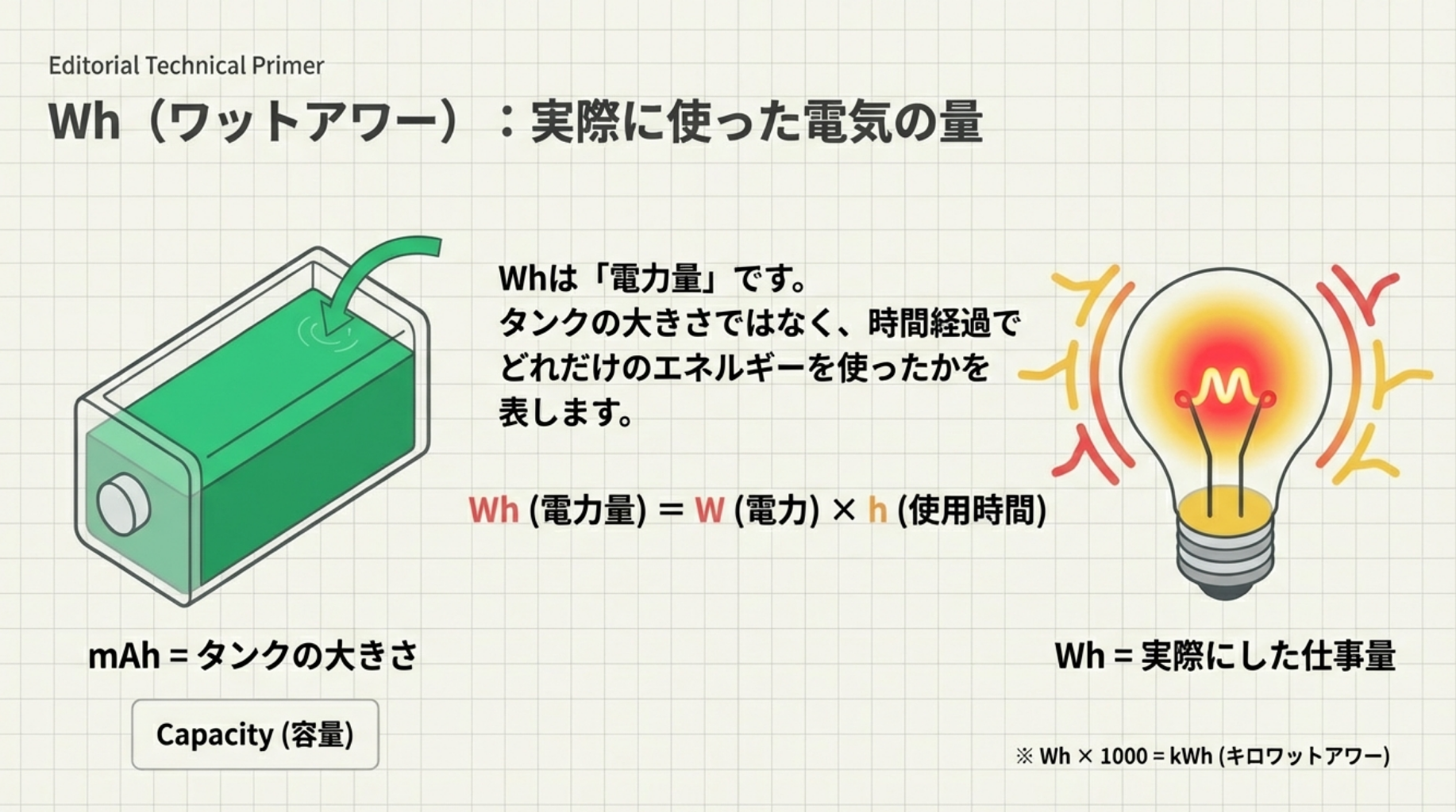 Wh(ワットアワー)は電気量のことで「電気を使った量」を表します。