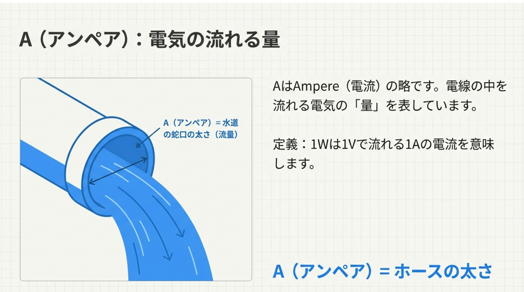 A(アンペアは電流のことで「電気の流れる量」を表します。