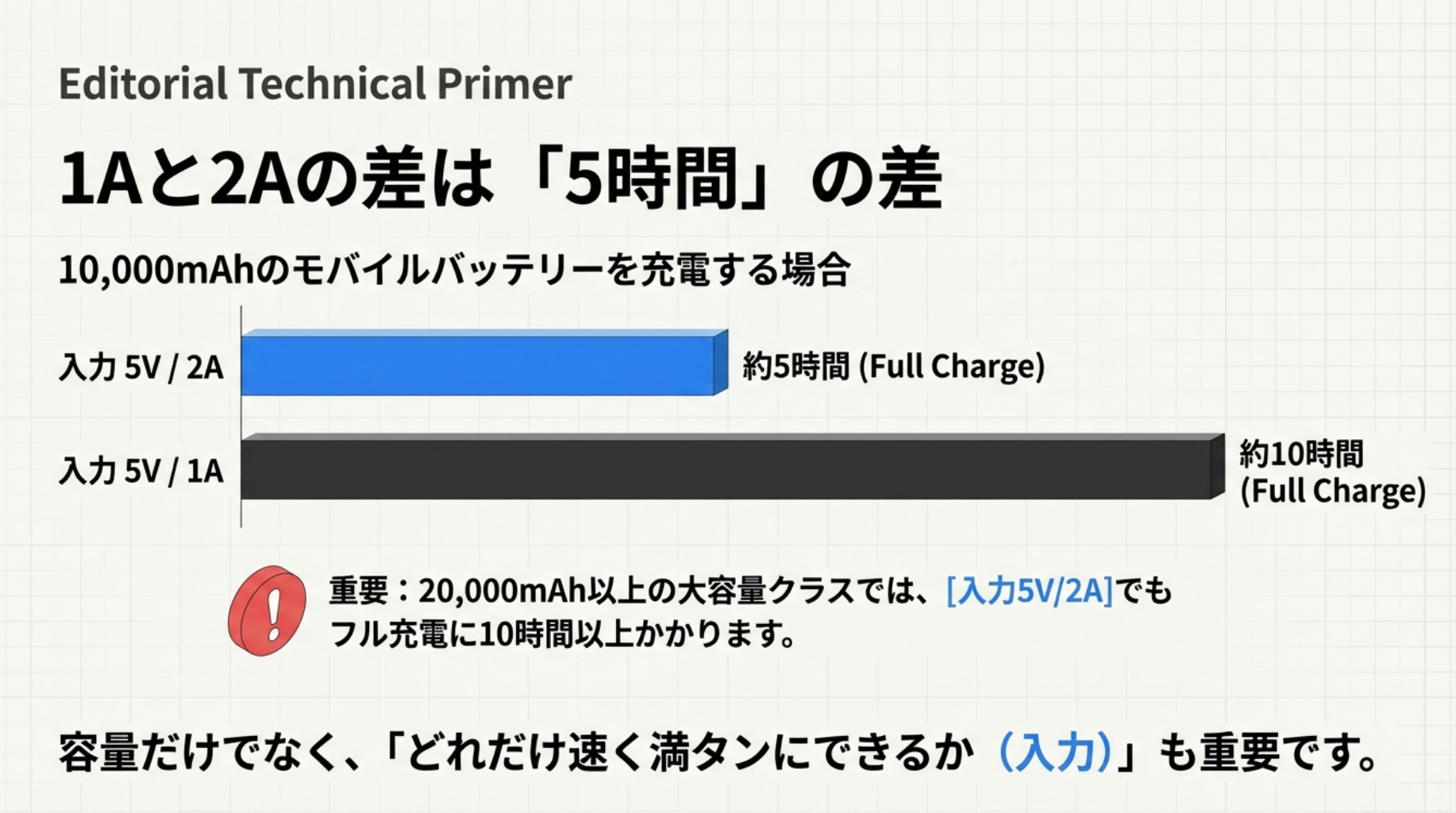 例えば、同じ10,000mAhのバッテリーでも、仕様書に「入力5V/2A」と書かれた製品は約5時間でフル充電できますが、「入力5V/1A」の製品だと約10時間もかかってしまいます。せっかく大容量でも、本体の充電に半日かかっていては不便です。