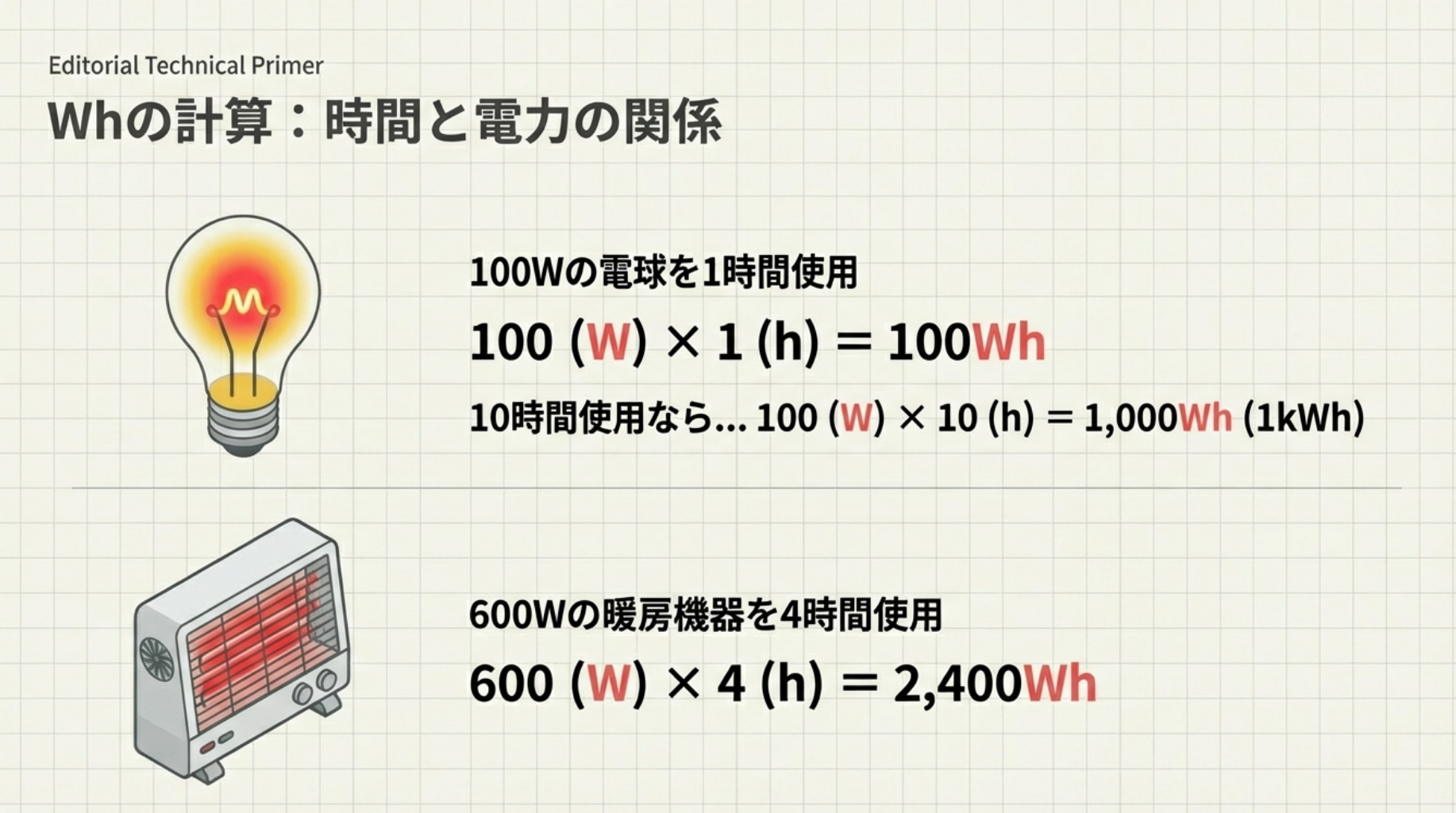 例)100Wの電球を1時間使用=消費電力量は100(W)×1(h)=100Wh