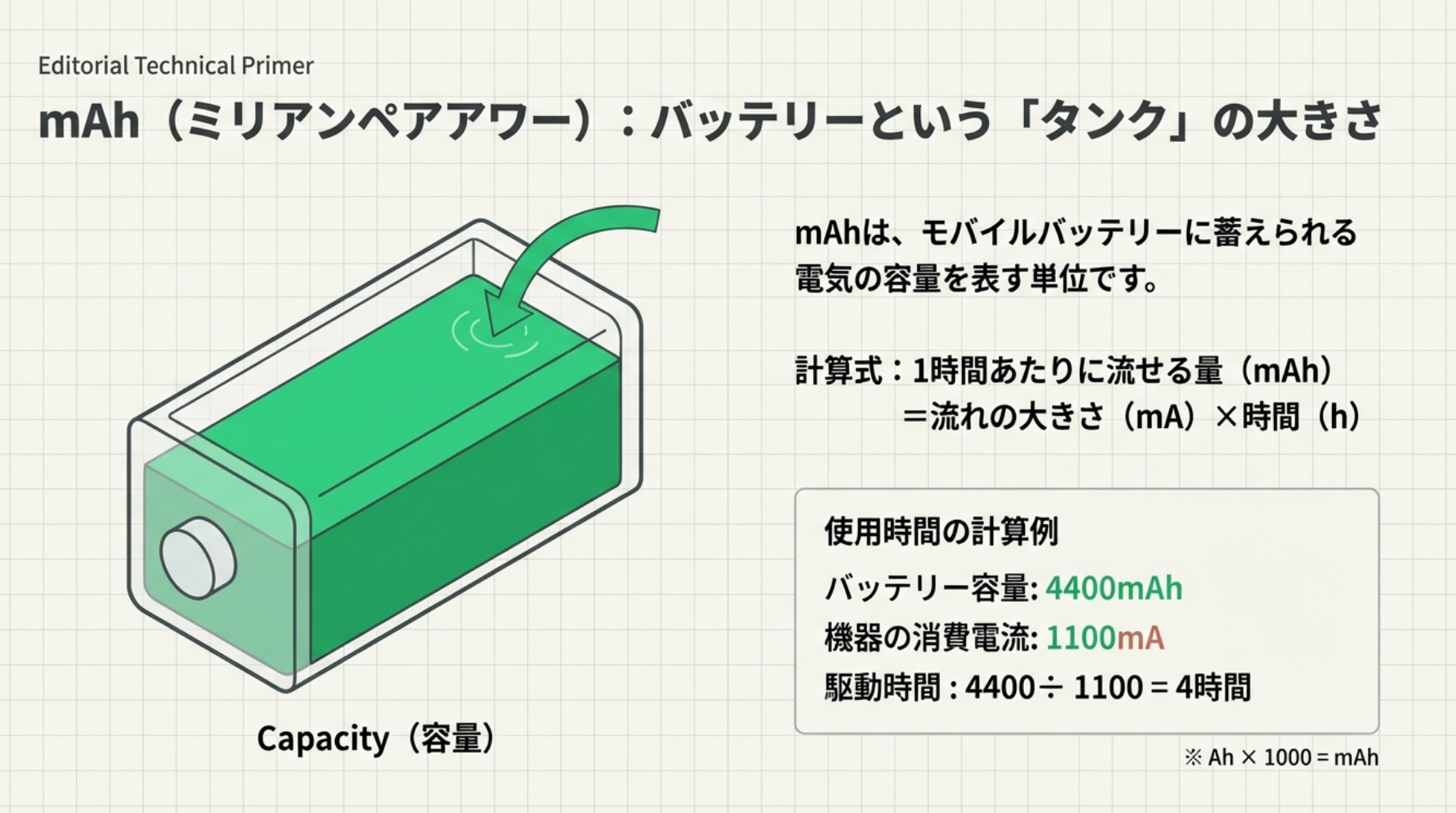 mAh(ミリアンペアアワー)は、モバイルバッテリーの容量を表す単位として使用されています。モバイルバッテリーに貯められる電気の容量のことです。