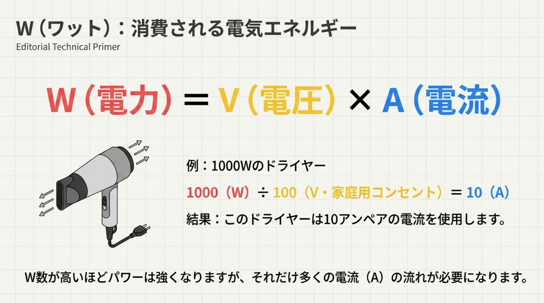 これらの関係は、W(電力)=V(電圧)×A(電流) という式で表せます。