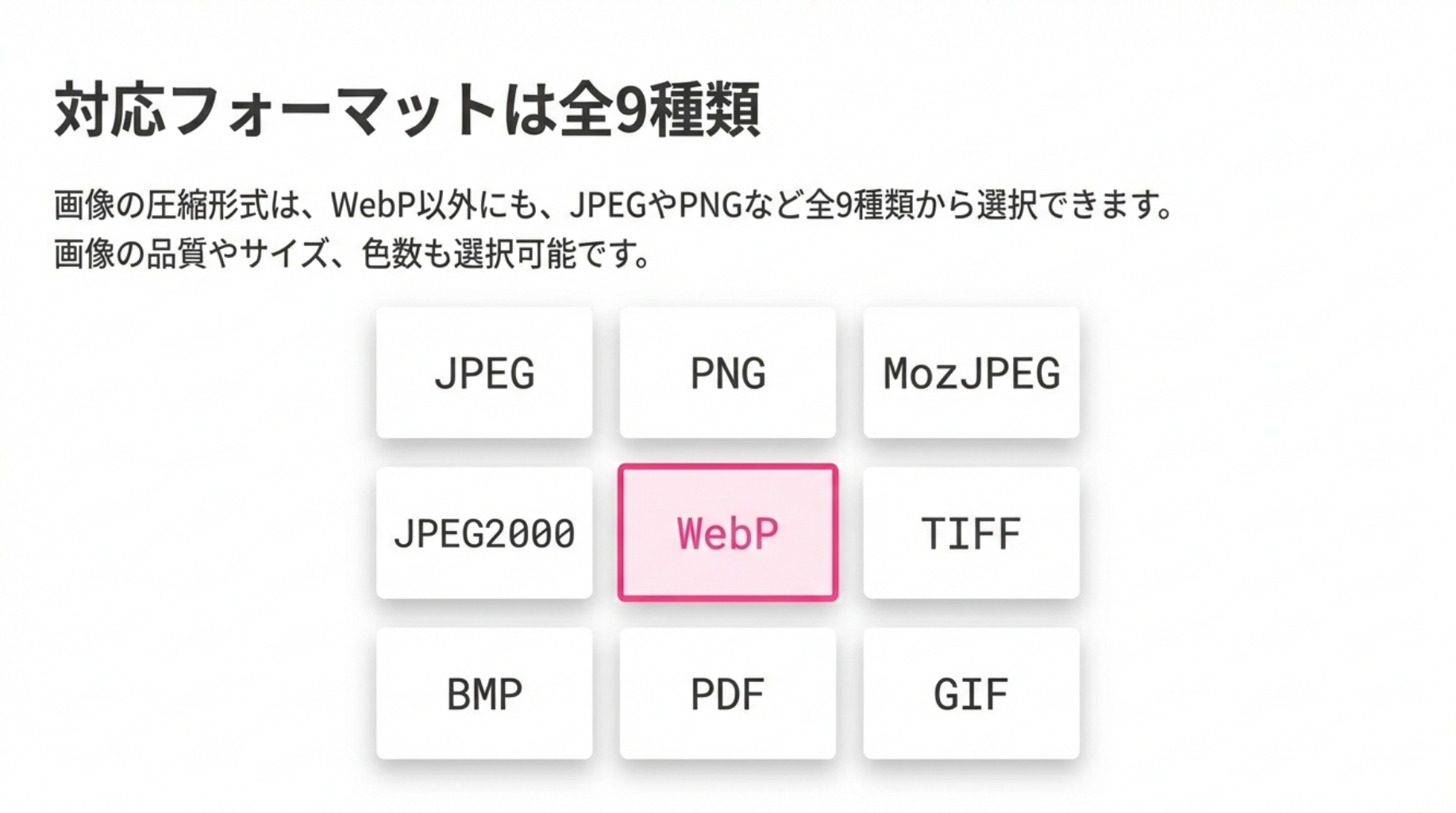 JPEG/PNG/MozJPEG/WebP/JPEG2000/TIFF/BMP/PDF/GIF