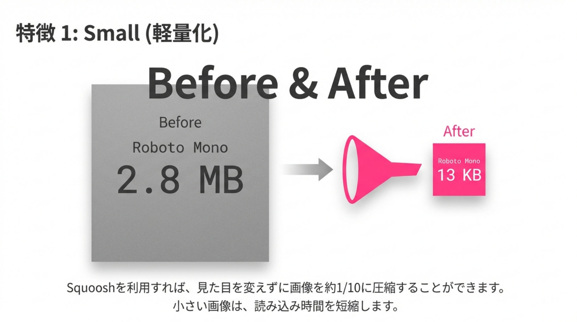 ウェブページに写真を貼り付けるとき、画像の解像度が高いと、クオリティは高いですが、ファイルサイズが大きいため、ロードに時間がかかります。Squooshを利用して圧縮すれば、見た目を変えずに画像を約1/10に圧縮することができます。