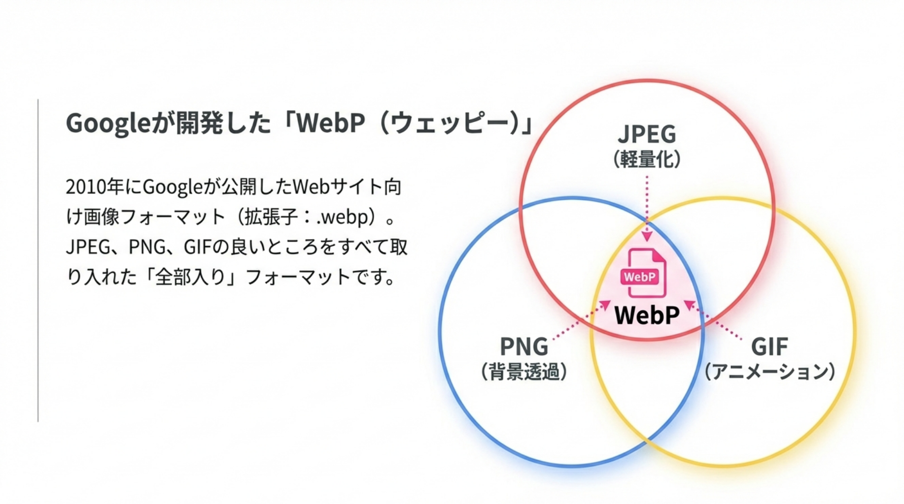 WebPは、JPEG、PNG、GIFの良いところをすべて取り入れた画像フォーマット