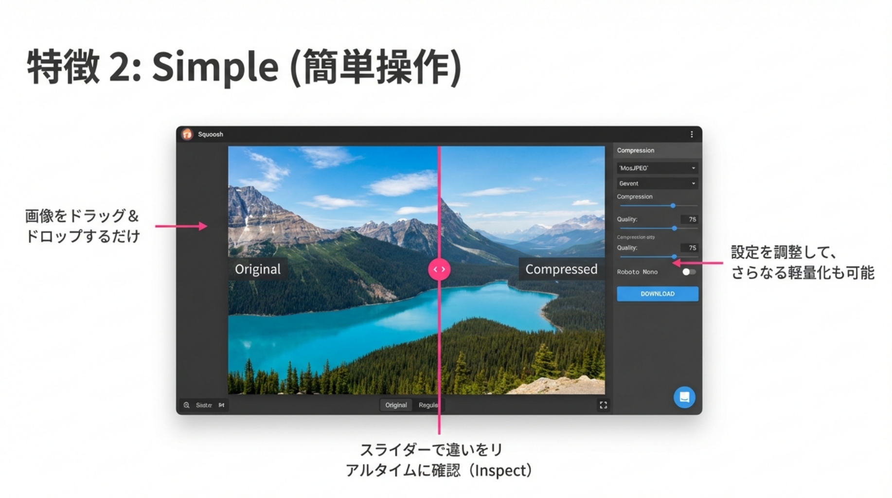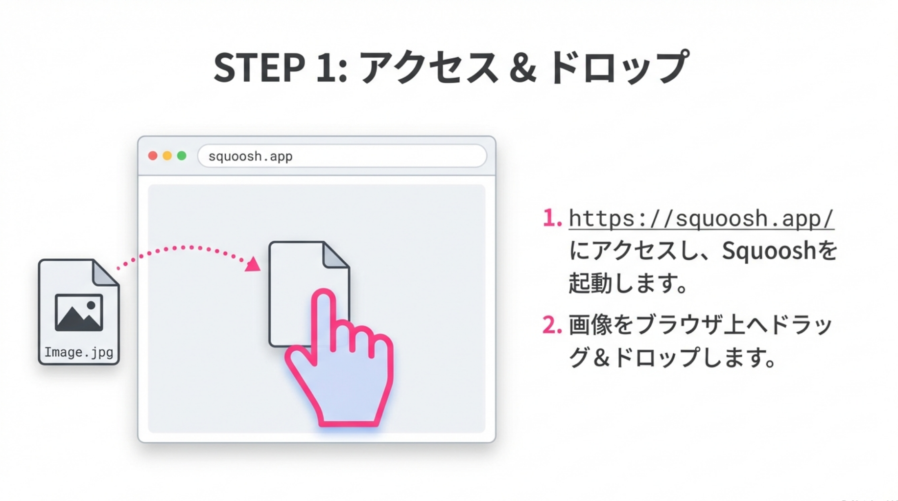 Squoosh(スクワッシュ)の使い方はとても簡単です。アプリのインストールは不要で、ブラウザ上で画像をドラッグ&ドロップし、スライダーを動かすだけ。どれだけファイルが小さくなるかをリアルタイムに確認しながら、直感的に圧縮率を調整できます。
