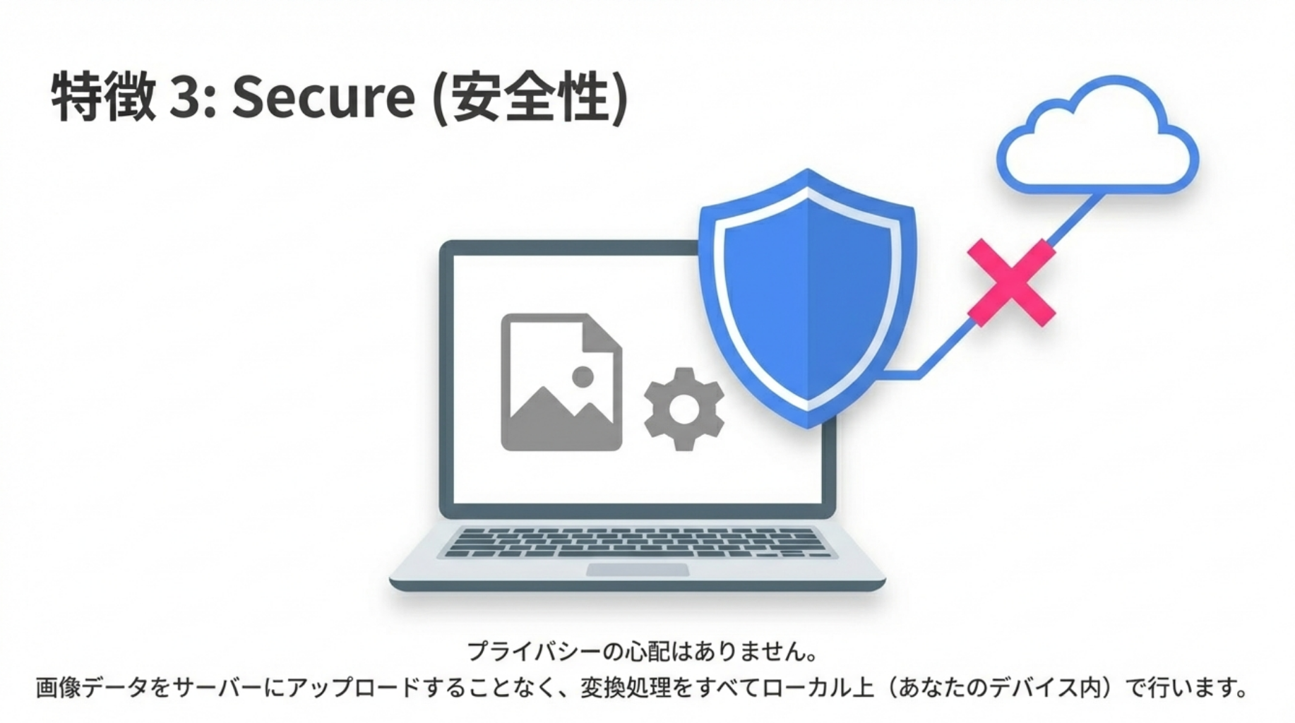 多くのオンライン画像ツールとSquooshを分ける決定的な違い、それは画像の処理がどこで行われるかにあります。Squooshでは、すべての処理がデバイス内(ローカル)で完結し、サーバーに画像がアップロードされることはありません。