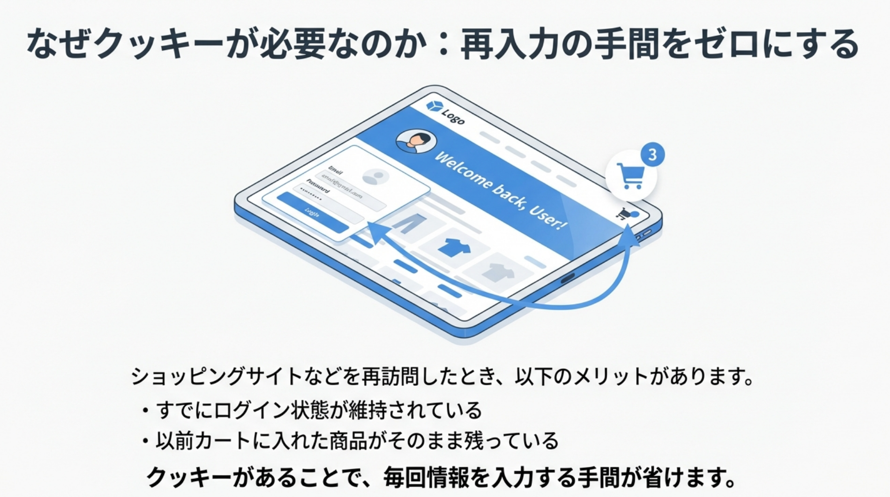 例えば、ショッピングサイトを再訪問したとき、すでにログイン状態になっていたり、以前カートに入れた商品がそのまま残っていたりするのは、このクッキーの働きによるものです。