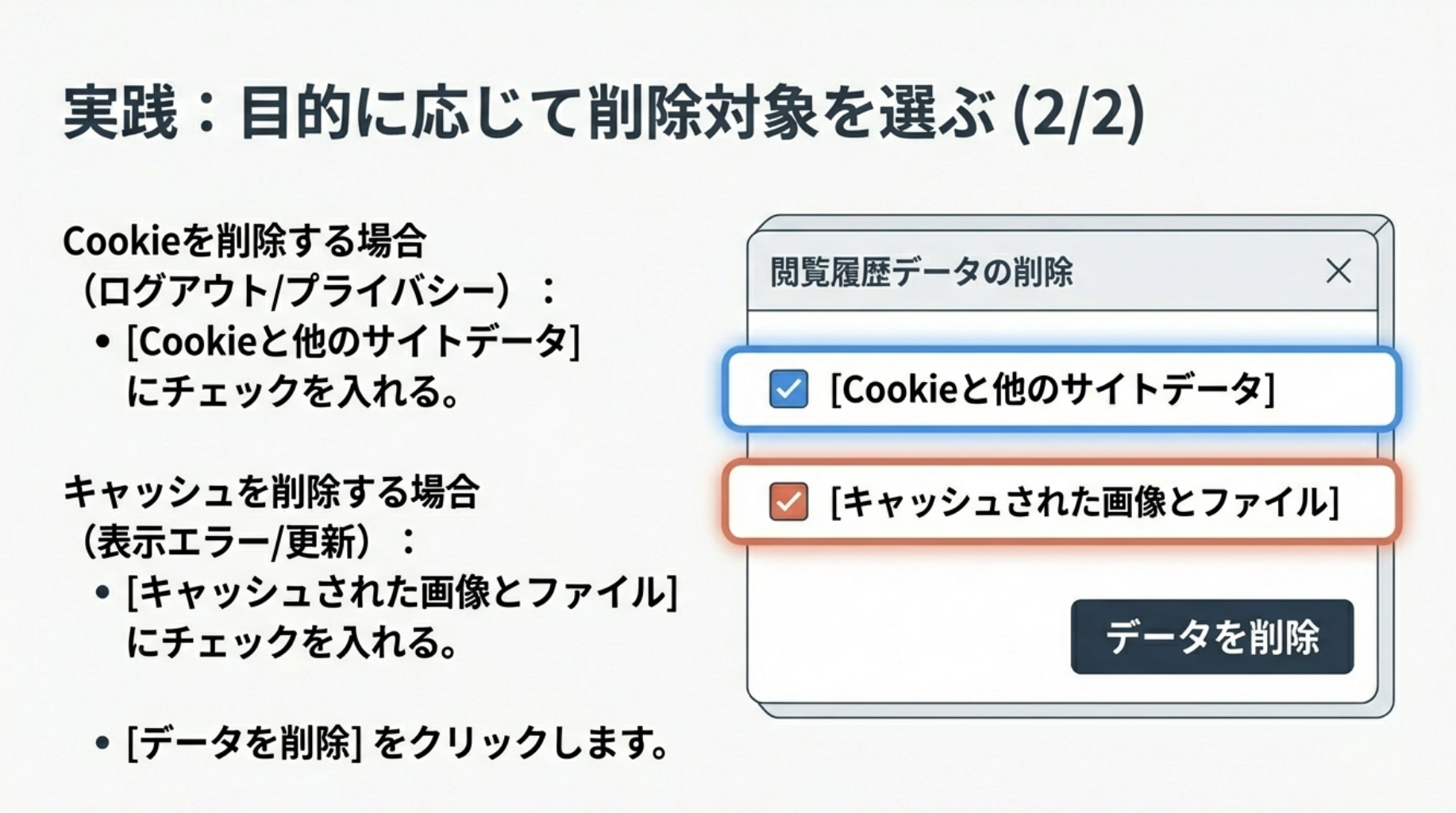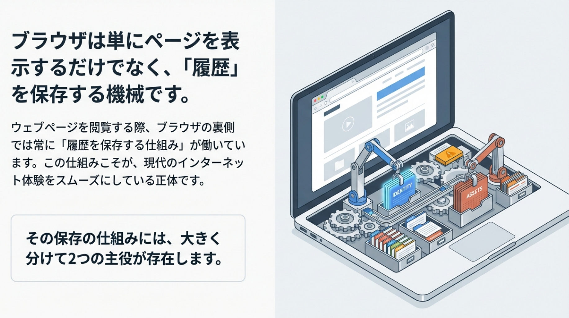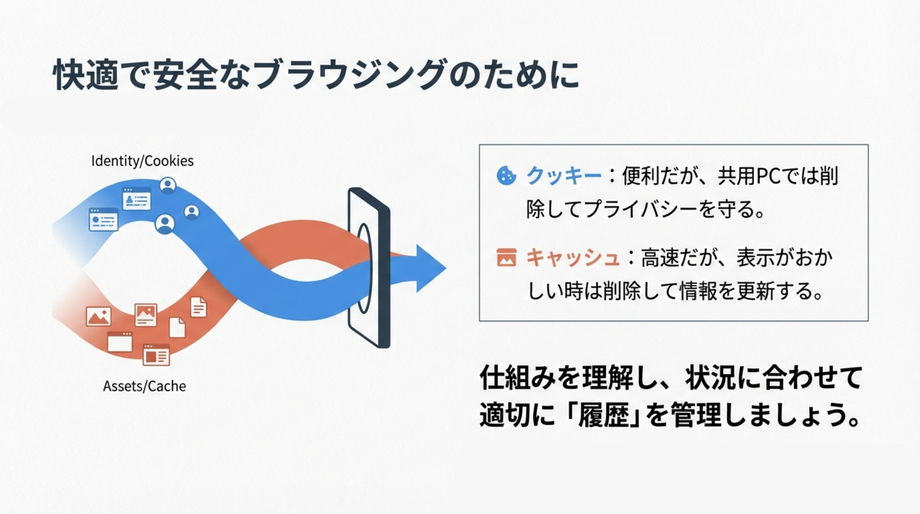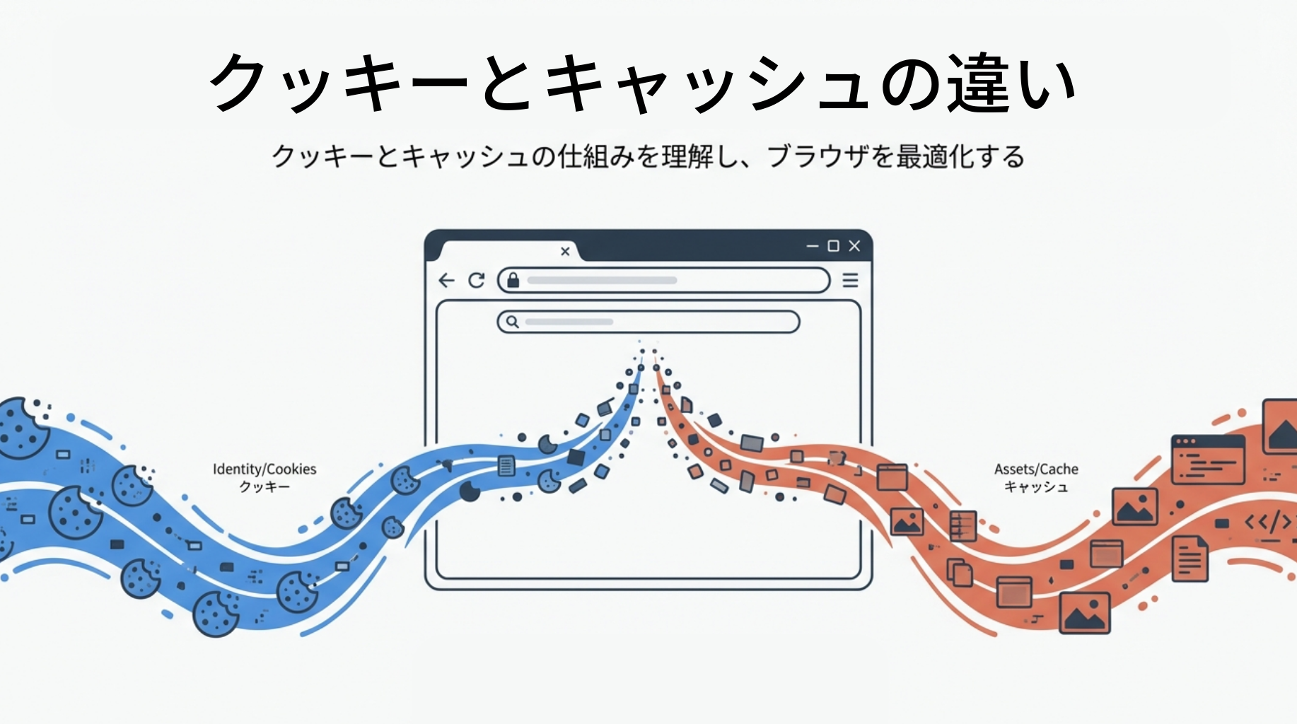クッキーとキャッシュは、どちらもWebページを閲覧したときの「履歴を保存する仕組み」ですが、その目的が根本的に異なります。