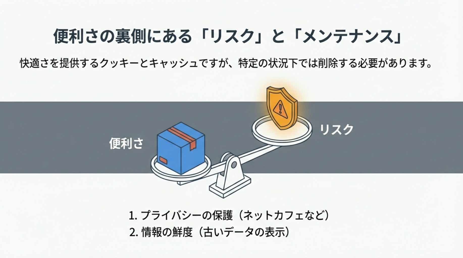 クッキーとキャッシュの機能は便利ですが、知っておくべき注意点もあります。
