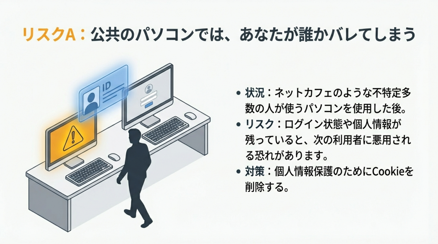 クッキーにはIDやパスワードといった個人情報が含まれることがあります。ネットカフェのように不特定多数の人が使うパソコンを使用した後は、個人情報を保護するためにクッキーを削除することが重要です。