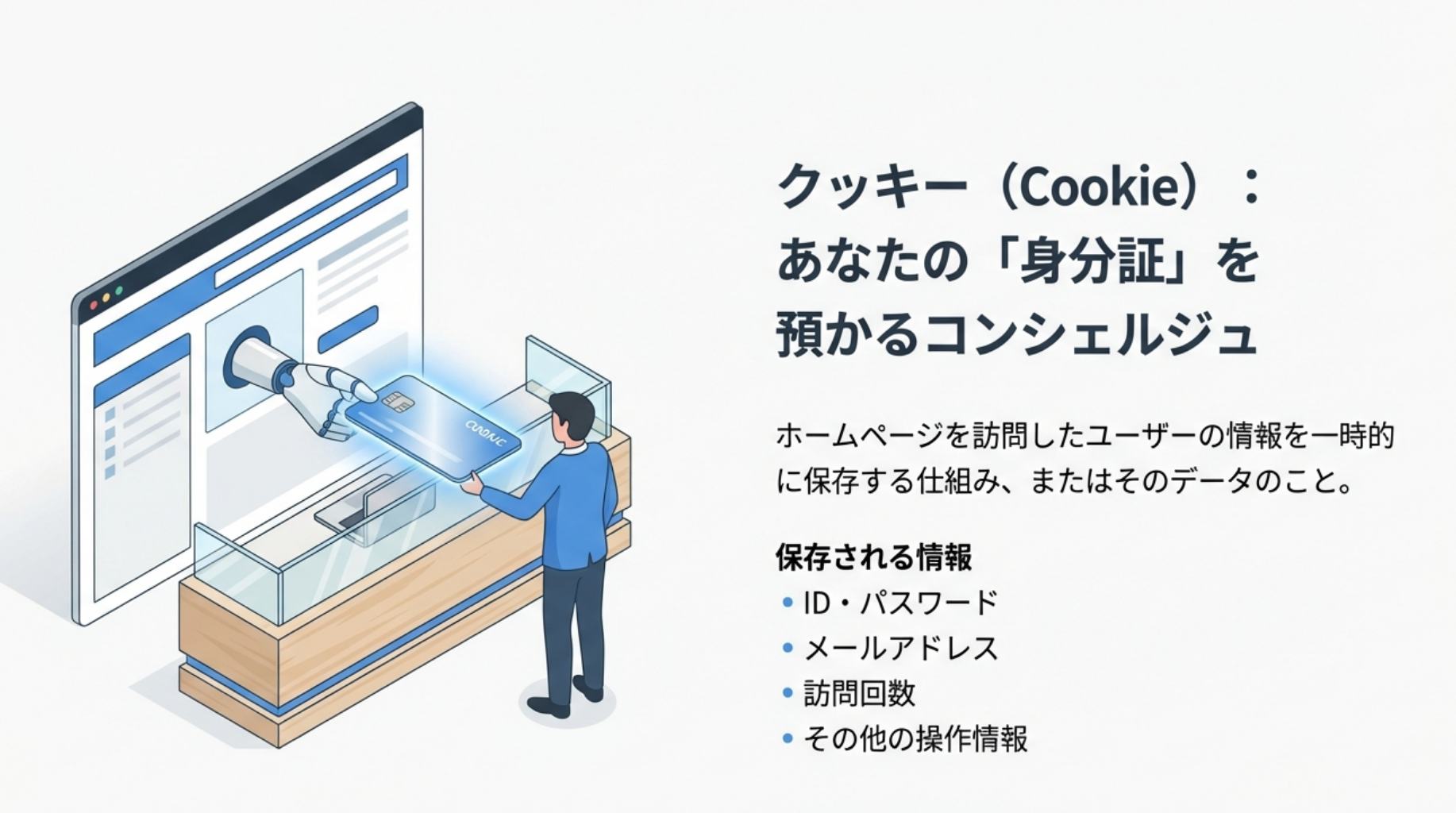 クッキーの目的は「ユーザー情報の保存」です。ユーザーがID、パスワード、メールアドレス、訪問回数などを入力したり、Webサイトを訪問したりしたときの情報が、お使いのブラウザに一時的に保存されます。この仕組みのおかげで、次に同じWebサイトを訪れたときに情報を再入力する手間が省けるというメリットがあります。