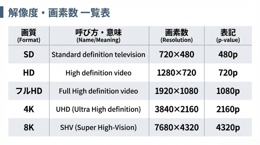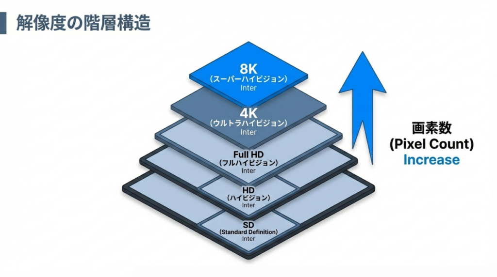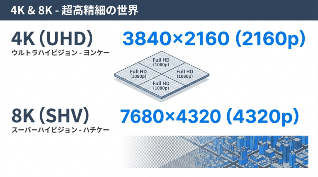 さらにその上には、フルHDや4K、8Kといった高精細な規格があります。