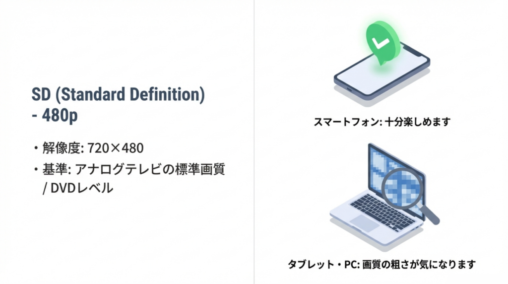 SD画質(エスディ)は、かつてのアナログテレビの標準画質であり、DVDと同等のレベルを指します。現在の基準では低画質に分類されますが、これを積極的に選ぶ場面もあります。