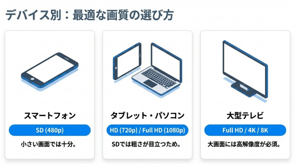 動画配信サービスを利用しているとき、「設定画面にあるSDやHDの違いがよく分からない」「気づかないうちに通信量が増えて速度制限がかかってしまった」といった悩みをお持ちではありませんか。高精細な映像は魅力的ですが、視聴するデバイスや通信環境に合わせて最適な画質を選ぶことは、快適なデジタルライフを楽しむためにも押さえておきたいポイントです。