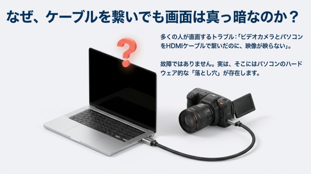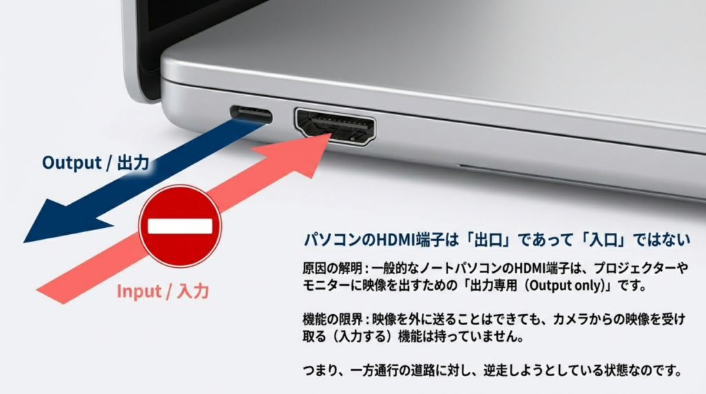 「パソコンとビデオカメラをHDMIケーブルでつなげば映るはず」と思われがちですが、実は落とし穴があります。一般的なノートパソコンに搭載されているHDMI端子は、映像を外に送るための「出力専用」で、ビデオカメラの映像をパソコンに取り込むための「入力機能」を持っていない場合がほとんどなのです。