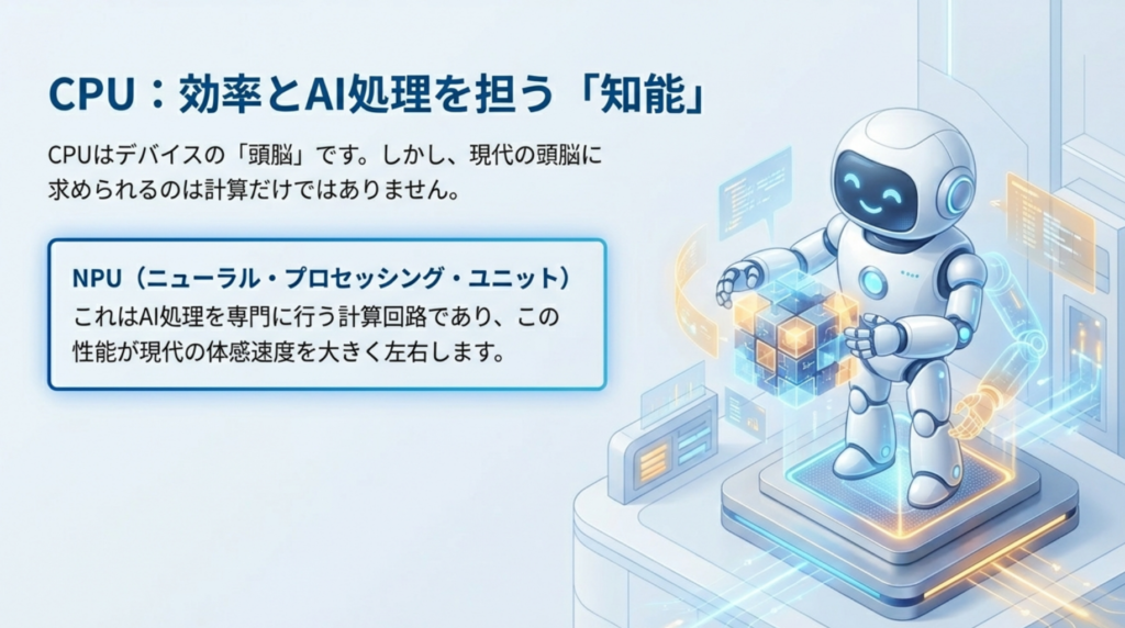 CPU(シーピーユー)は、デバイスに届くあらゆる命令を処理する、最も重要なパーツです。現在では、単なる計算速度だけでなく、AI処理を専門に行うNPU(ニューラル・プロセッシング・ユニット:AI専用の計算回路)の性能が、体感速度に大きく影響します。