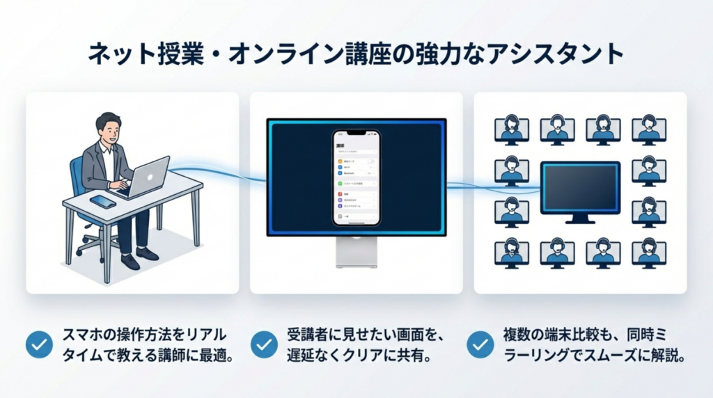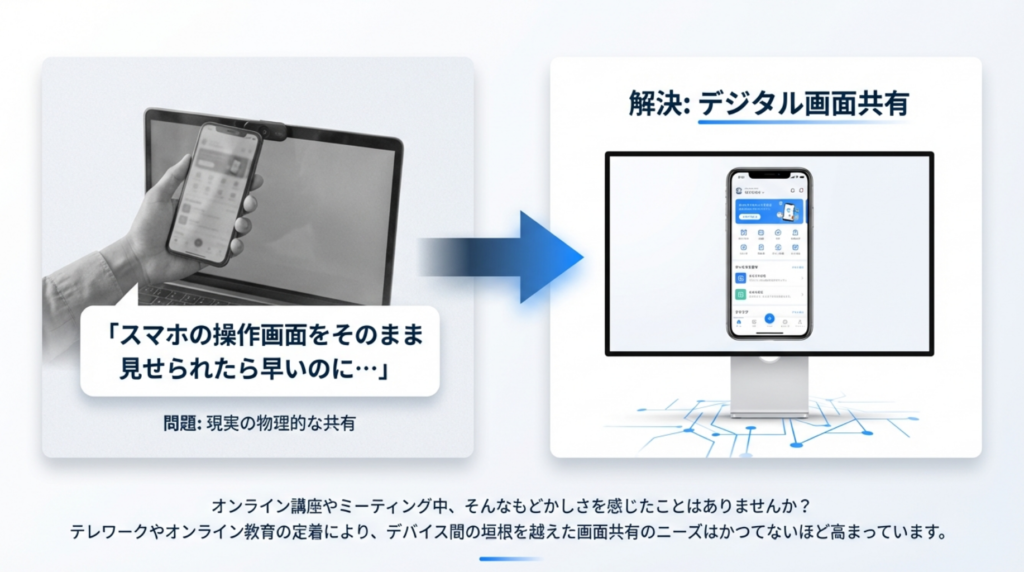 オンラインでの講座やミーティング中、「スマホの操作画面をそのまま見せられたら早いのに…」と感じたことはありませんか?テレワークやオンライン教育の定着により、デバイス間の垣根を越えた画面共有のニーズはかつてないほど高まっています。