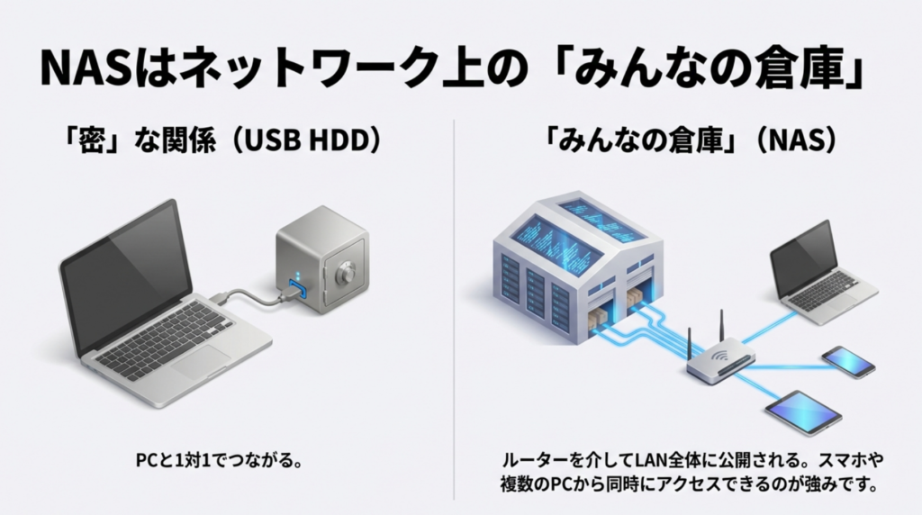 NAS(Network Attached Storage|ネットワーク・アタッチド・ストレージ)、一言で言えば「LANケーブルでつなぐハードディスク」のことです。一般的な外付けHDDがパソコンと1対1で「密」な関係を築くのに対し、NASはルーターやハブを介してネットワーク(LAN:家庭内や社内の情報網)全体に公開されます。スマホや複数のPCから同時にアクセスできるのが最大の強みです。