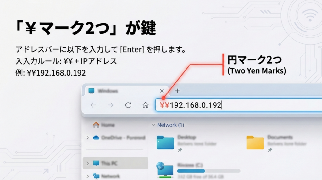 Windowsのエクスプローラーを開いてもNASのアイコンが出てこない……。そんな時は、NASの「住所」であるIPアドレス(ネットワーク上の識別番号)を直接打ち込むのが一番の近道です。エクスプローラーを開き、一番上の「アドレスバー」に「¥¥(円マーク2つ)」 を入力し、続けてNASのIPアドレス(例:192.168.0.192)を入力し[Enter]キーを押します。