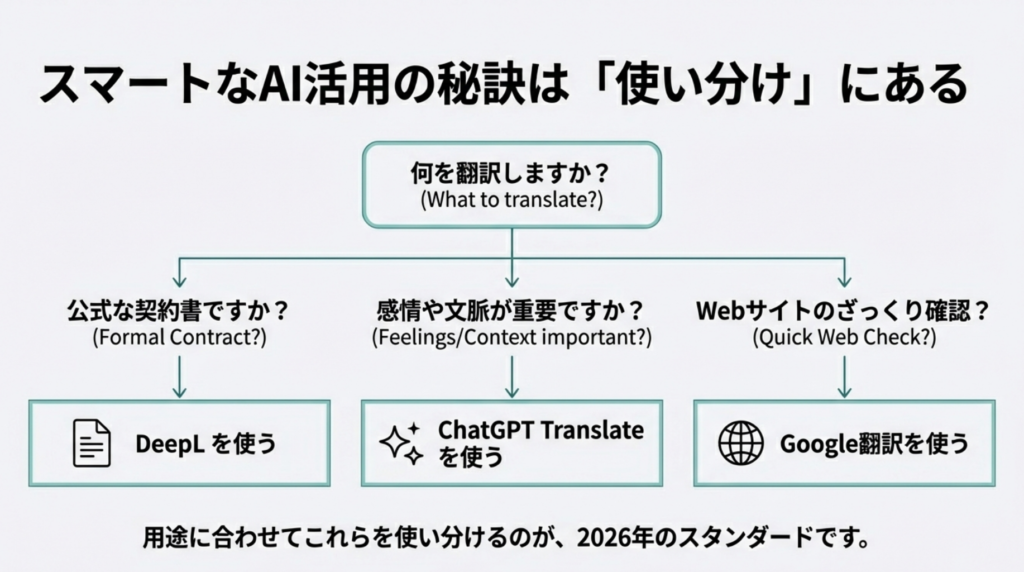 2026年の翻訳シーンにおいて、ChatGPT Translateは「クリエイティブな翻訳」や「対話が必要な翻訳」において最強のツールです。