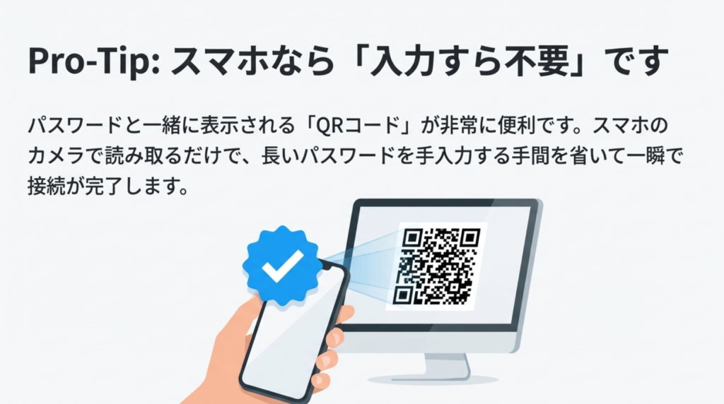 パスワードと一緒に表示される 「QRコード」 は非常に便利です。スマホのカメラで読み取るだけで、長いパスワードを手入力する手間を省いて一瞬で接続が完了します。
