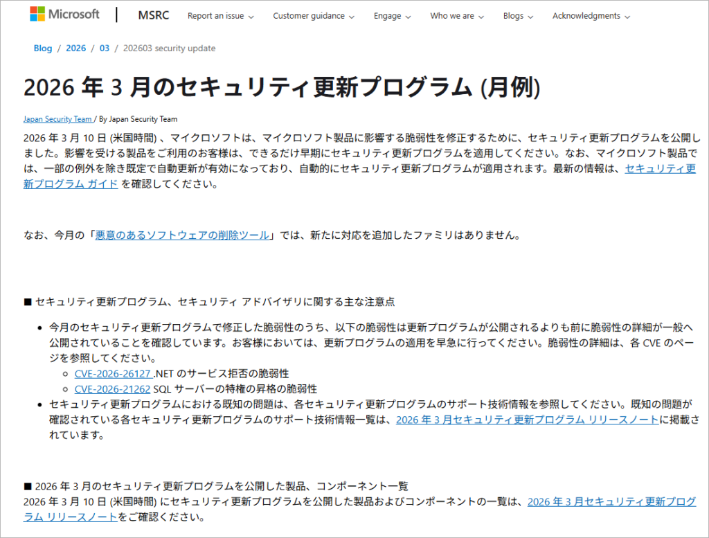 マイクロソフトは、2026年3月11日(日本時間)に、月例のセキュリティ更新プログラム(修正パッチ)を公開しました。この更新を適用することで、Windows11やMicrosoft Officeに存在する脆弱性(ぜいじゃくせい)が修正されます。
