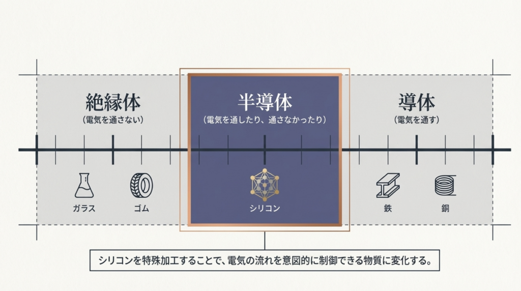 半導体とは、電気を通す「導体」(例:鉄、銅)と、電気を通さない「絶縁体」(例:ガラス、ゴム)の中間の性質を持つ物質のことです。