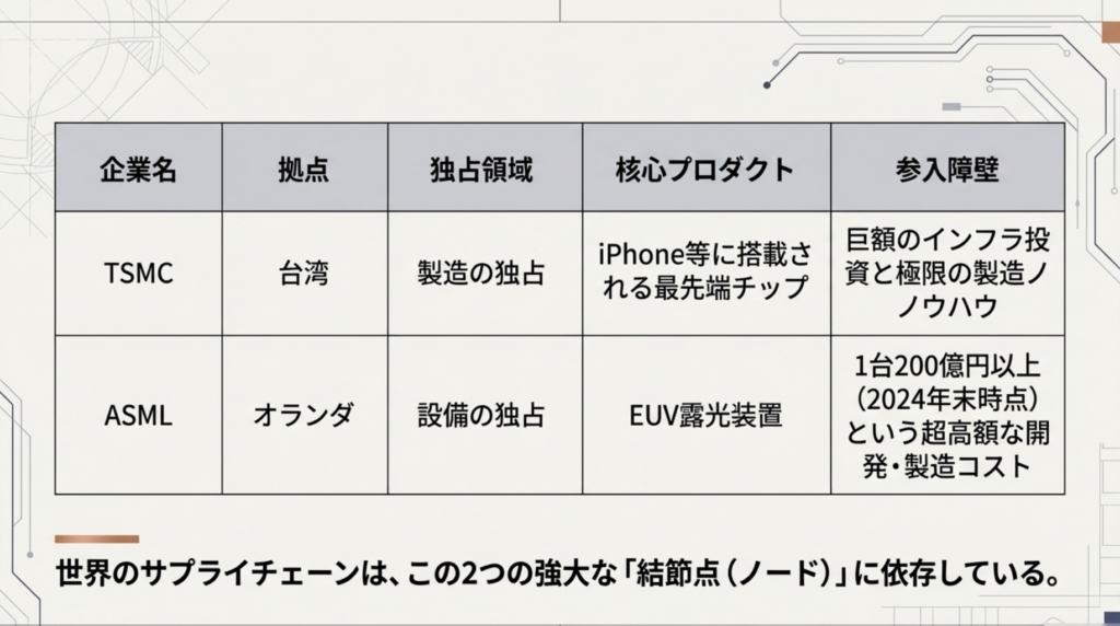 - ASML(オランダ): 最先端の半導体製造に不可欠な「EUV露光装置」をほぼ独占的に製造しています。この装置は1台200億円以上と非常に高価です。