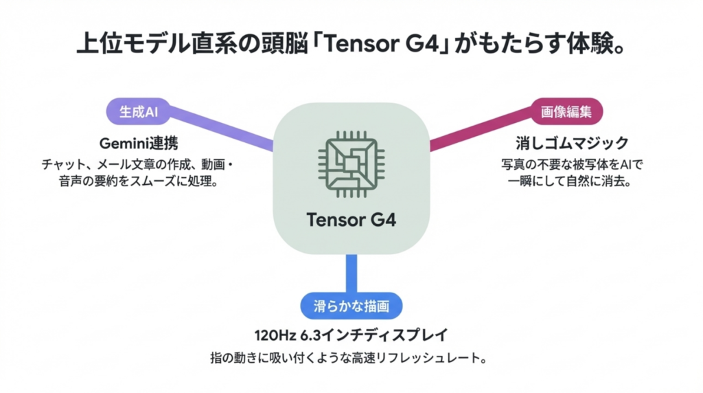 心臓部には、上位モデルと同じTensorG4(テンサー・ジーフォー)というチップ(スマートフォンの頭脳となる部品)を搭載しています。これにより、Geminiを活用した文章作成の補助や、写真の不要なものを消去する「消しゴムマジック」なども非常にスムーズに動作します。
