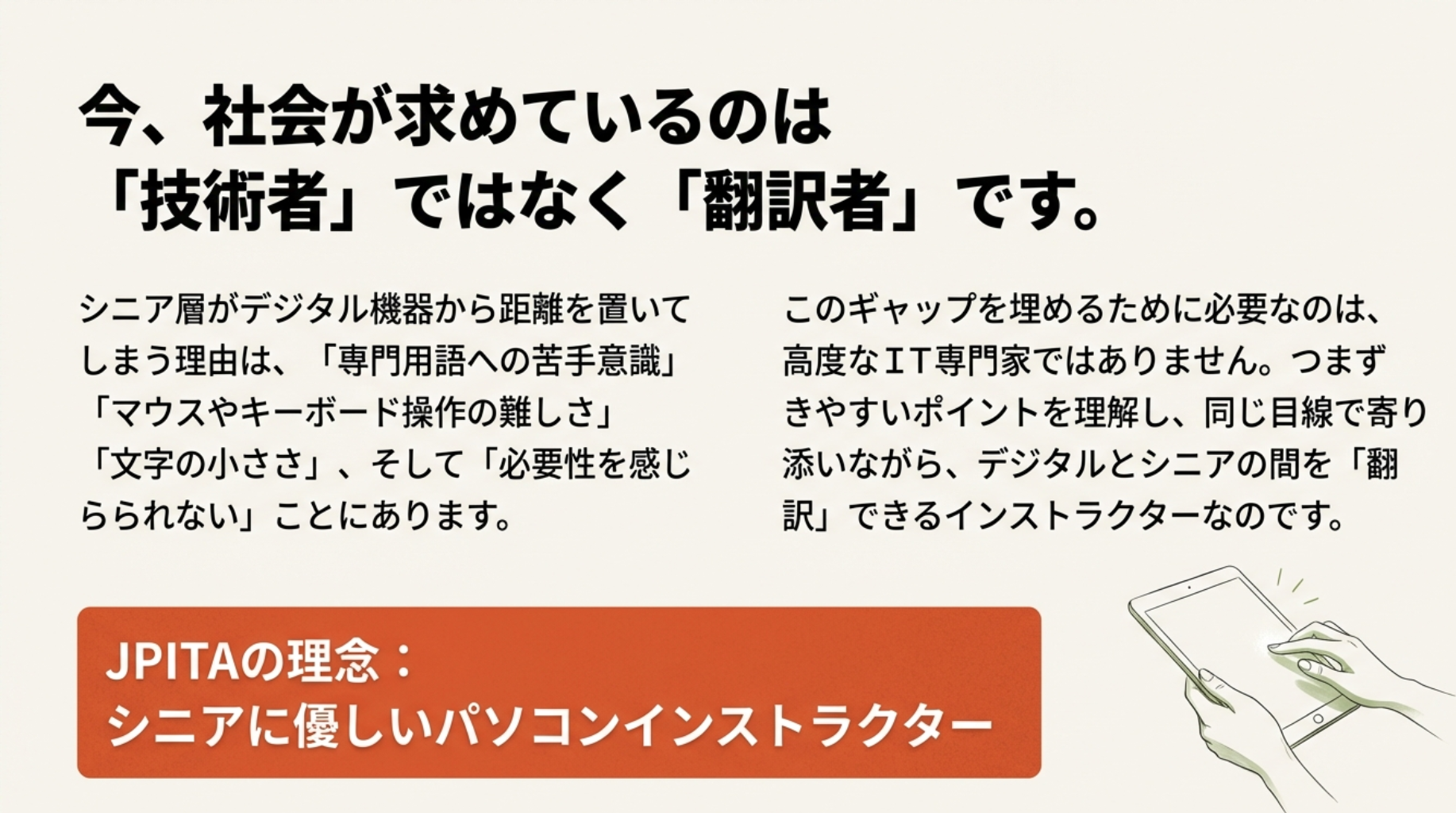 この職業の本質は、自分がPCを巧みに操作できることではなく、他人が理解できるように教える技術にあります。